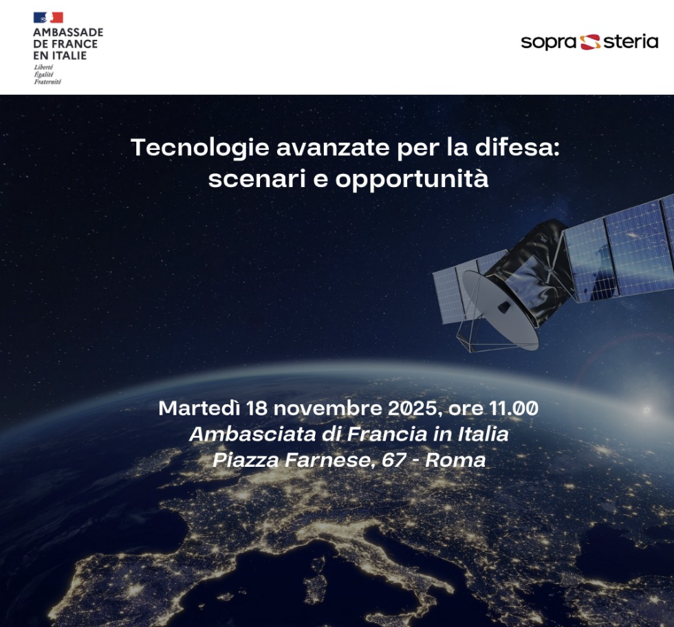 GD - Roma, 14 nov. 25 - Nell'Ambasciata di Francia in Italia a Palazzo Farnese martedì 18 novembre, alle ore 11.00, si terrà l'evento "Tecnologie avanzate per la difesa: scenari e opportunità", promosso da Sopra Steria Italia in collaborazione con l'Ambasciata di Francia.