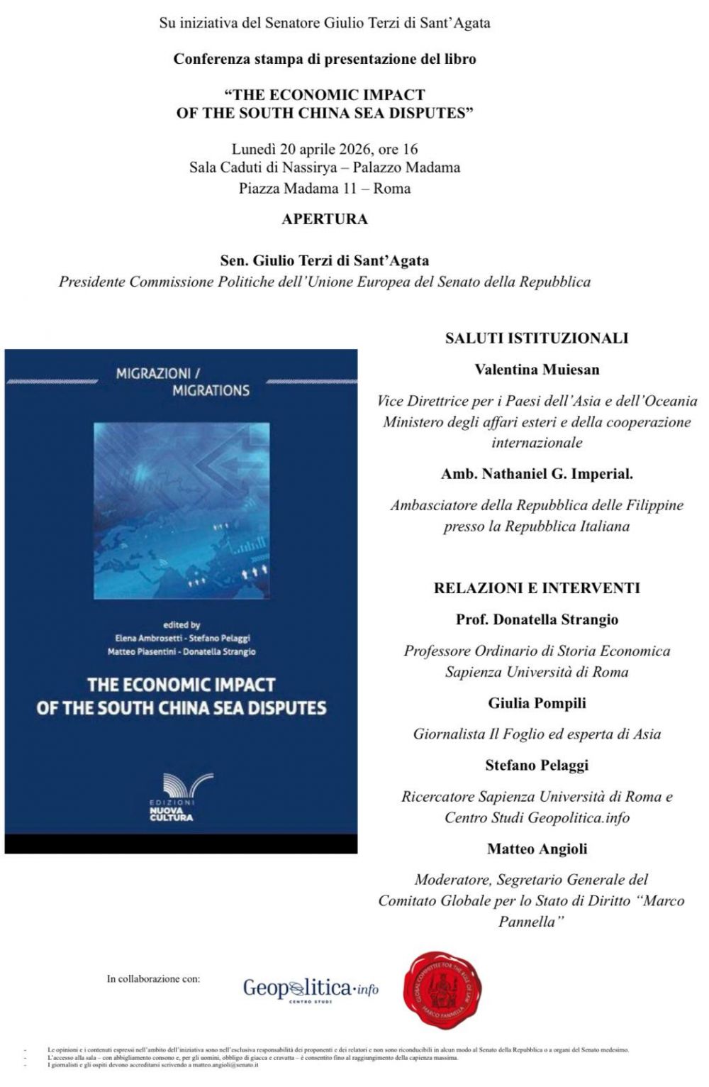 GD - Roma, 14 apr. 26 - Il Comitato Globale per lo Stato di Diritto "Marco Pannella" e il Centro Studi Geopolitica.info, con il sen. Giulio Terzi, presidente della Commissione Politiche dell'Unione Europea del Senato della Repubblica, hanno promosso per lunedì 20 aprile, alle ore 16:00, nella Sal...