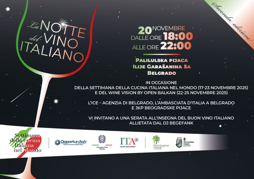 GD - Belgrado, 21 nov. 25 - L’Ambasciatore d’Italia in Serbia, Luca Gori, ha aperto la seconda edizione della “Notte del vino italiano” al Palilulska Pijaca a Belgrado nell’ambito della Settimana della Cucina Italiana nel Mondo.