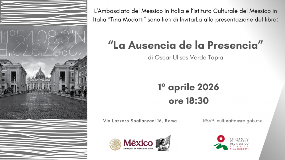 GD - Roma, 25 mar. 26 - L’Ambasciata del Messico in Italia e l’Istituto Culturale del Messico in Italia “Tina Modotti” hanno organizzato la presentazione del libro "La Ausencia de la Presencia" di Oscar Ulises Verde Tapia, mercoledì 1° aprile alle ore 18:30 nella sede diplomatica di Via Lazzaro S...