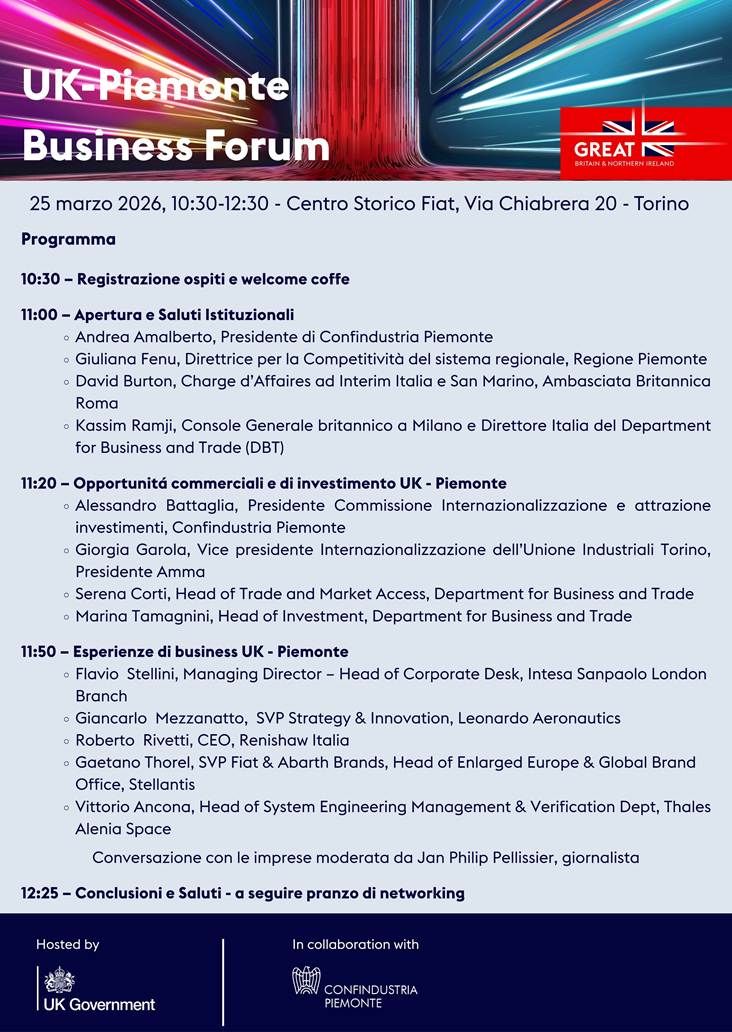 GD - Torino, 25 mar. 26 – All'insegna di una grande partecipazione di pubblico, si è svolto oggi il "UK–Piemonte Business Forum", ospitato nel Centro Storico FIAT dall’Ambasciata britannica a Roma, dal Department for Business and Trade in Italia e da Confindustria Piemonte, che ha riunito istituz...