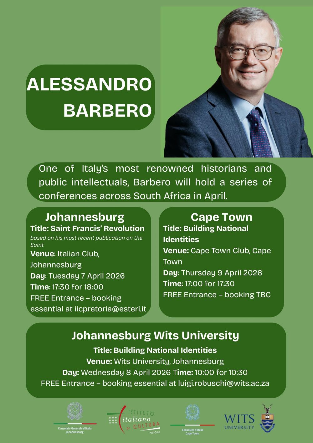 IIC Pretoria: tournée in Sud Africa dello storico Alessandro Barbero