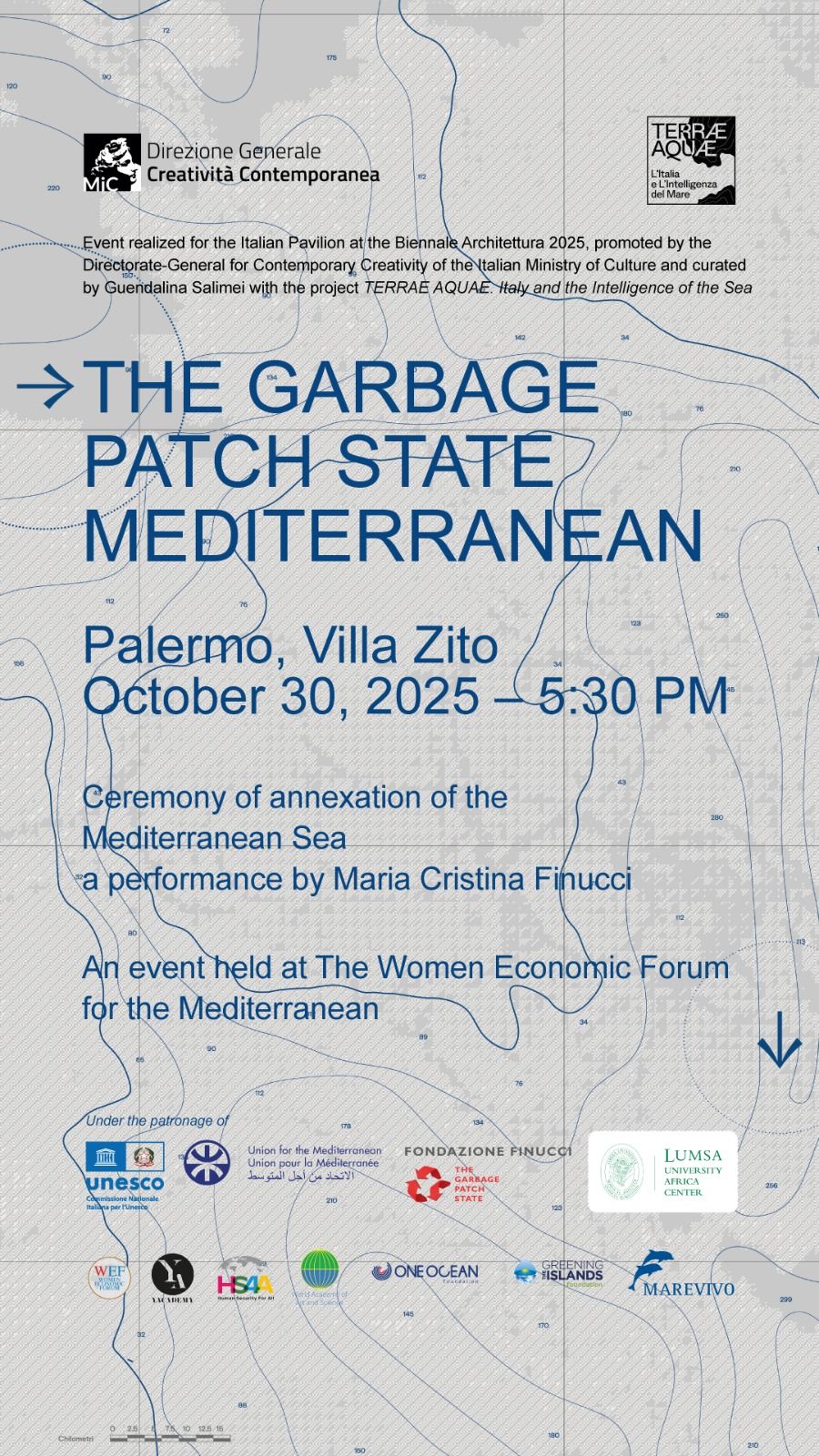 GD - Palermo, 30 ott. 25 - L'artista italiana arch. Maria Cristina Finucci ha presentato oggi a Palermo, a Villa Zito, la sua performance "The Garbage Patch State Mediterranean", ossia L'isola Spazzatura nel Mediterraneo, un evento del Padiglione Italia alla Biennale di Architettura di Venezia 20...