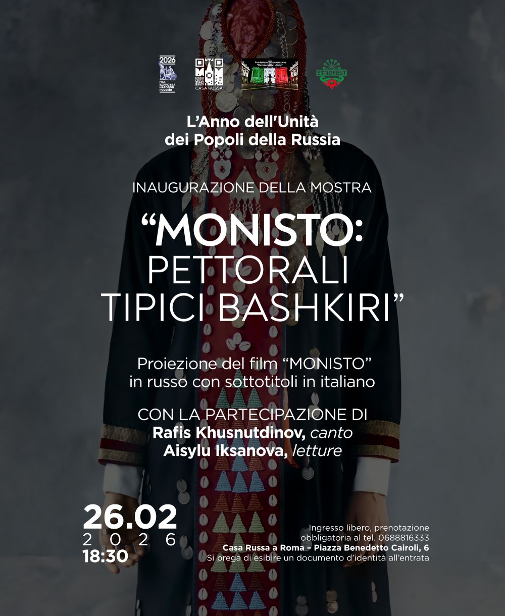 GD - Roma, 20 feb. 26 - Casa Russa a Roma giovedì 26 febbraio, alle ore 18.30, presenterà una mostra degli elementi di abbigliamento femminile popolare bashkiro. I visitatori potranno vedere i lavori della “nonna di tutto il popolo” da Ufa – così viene chiamata l’88enne Albina Iskhakova, che ha c...
