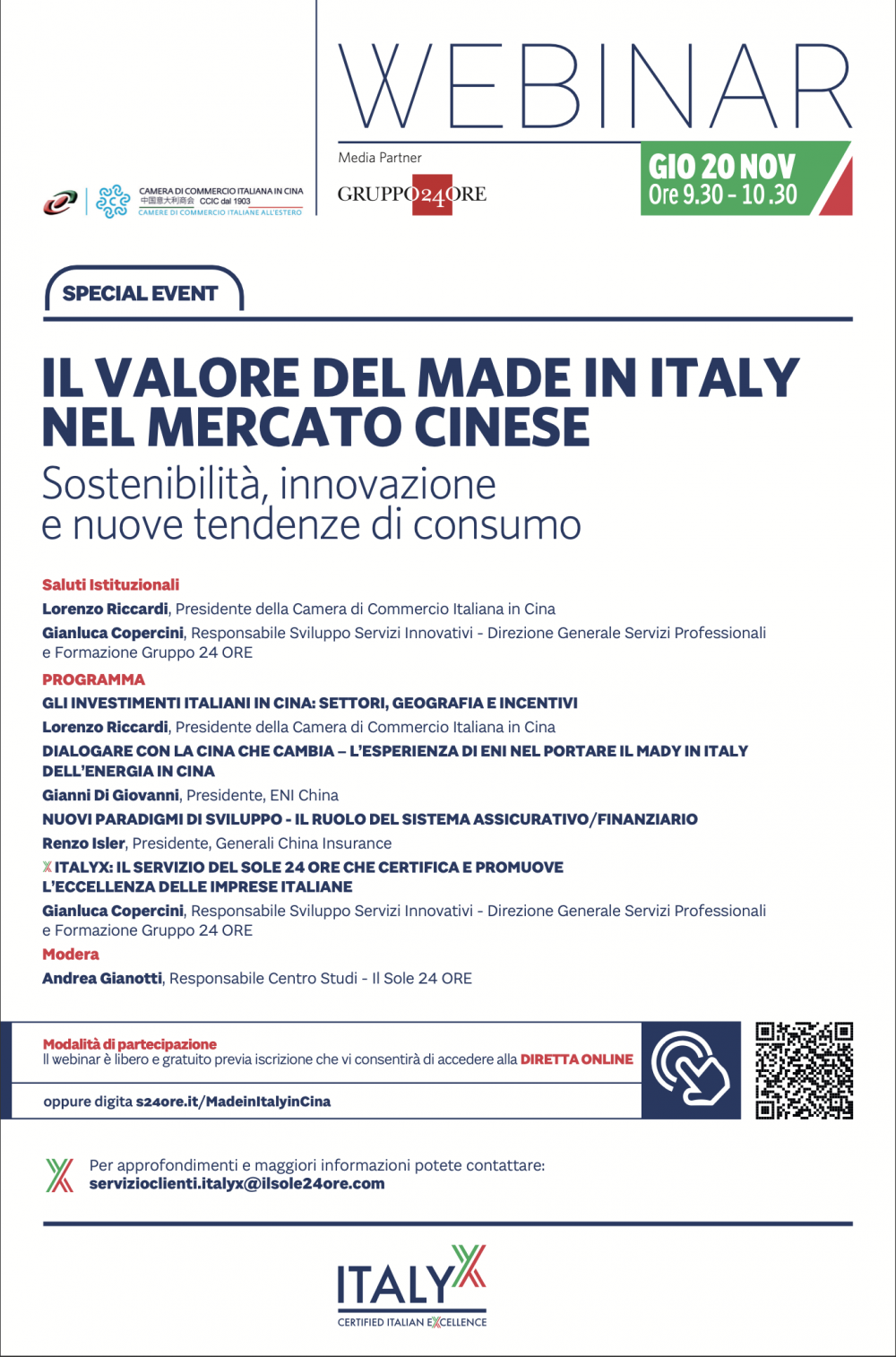 GD - Pechino, 18 nov - La Camera di Commercio Italiana in Cina, in collaborazione con il quotidiano "Il Sole 24 Ore", organizza il 20 novembre il webinar “Il valore del Made in Italy nel mercato cinese: sostenibilità, innovazione e nuove tendenze di consumo”, un appuntamento dedicato alle imprese...