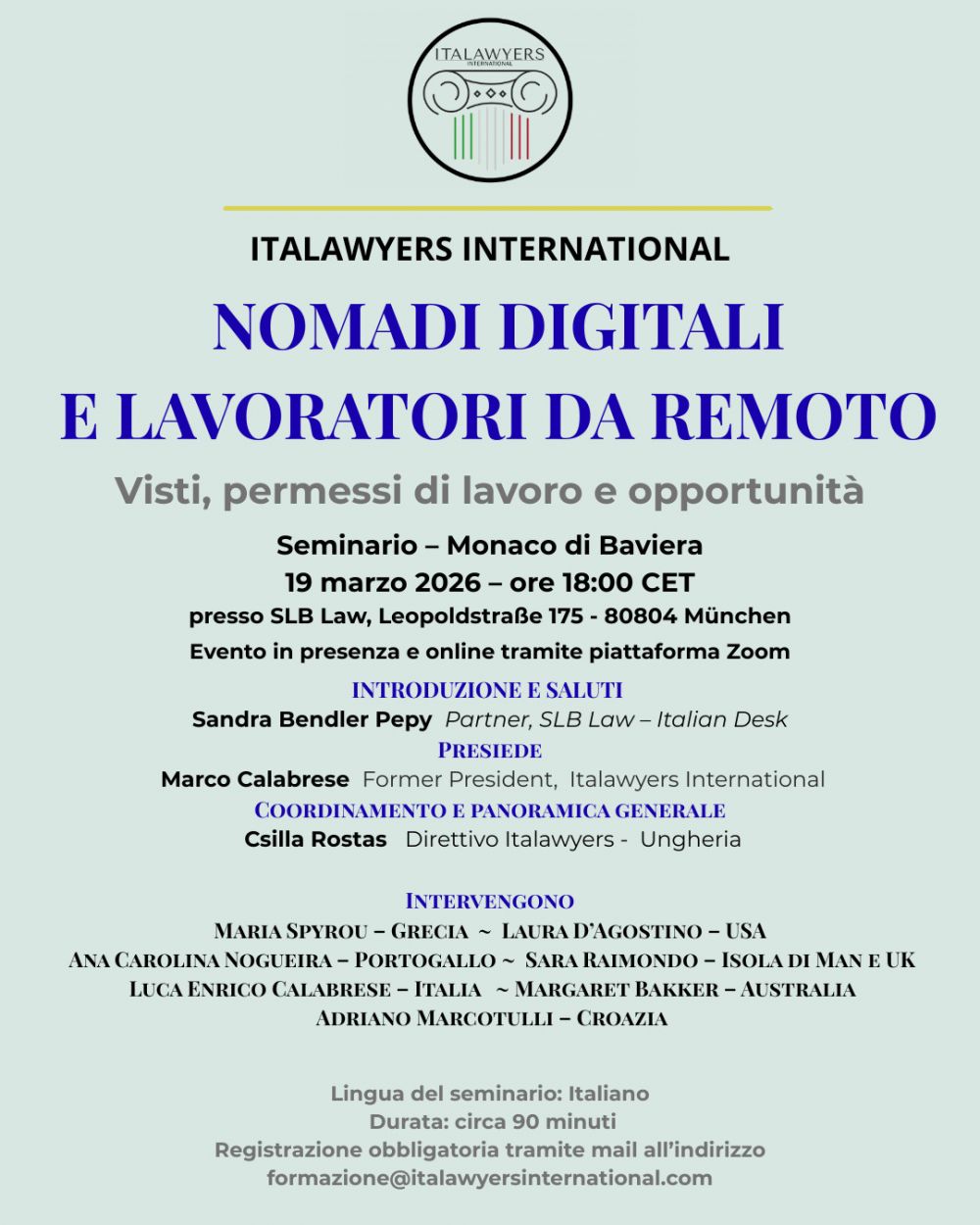 GD - Monaco di Baviera, 23 mar. 26 – Si è svolto con grande partecipazione il VI International Meeting di Italawyers International, che ha riunito avvocati e professionisti del diritto provenienti da numerose giurisdizioni, confermando il ruolo dell'associazione come punto di riferimento internaz...