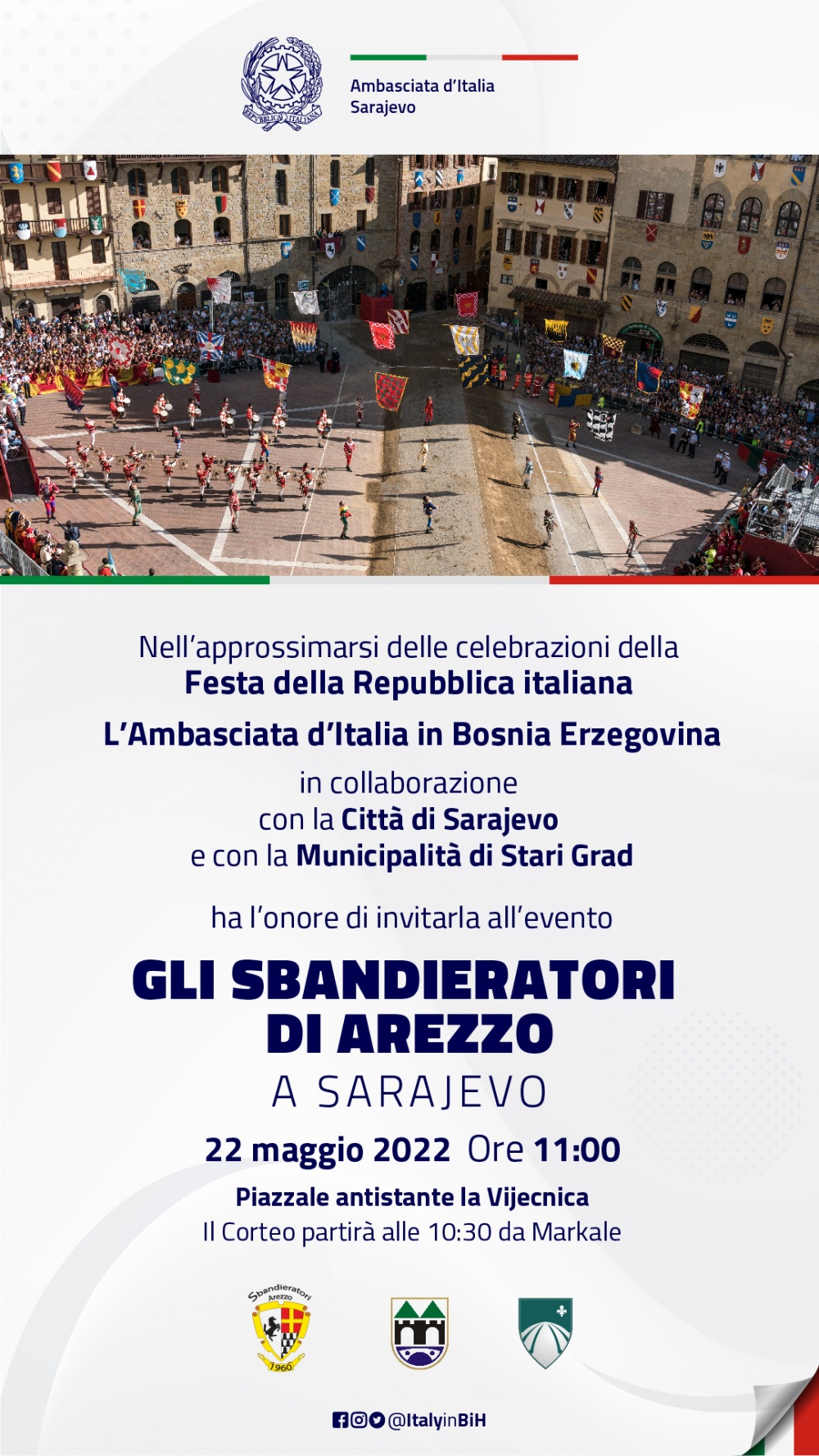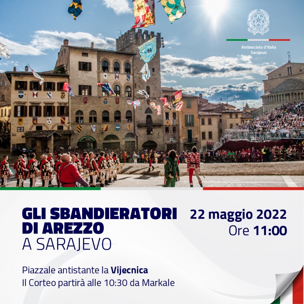 GD - Sarajevo, 17 mag. 22 - Nell’approssimarsi delle celebrazioni della Festa della Repubblica Italiana, l’ambasciata d’Italia in Bosnia Herzegovina ha organizzato l’evento “Gli sbandieratori di Arezzo a Sarajevo”, in collaborazione con la Città di Sarajevo e con la Municipalità di Stari Grad.
