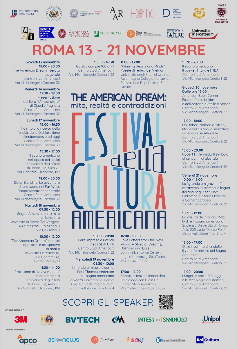 Il programma completo del Festival è disponibile sul sito del Centro Studi Americani: https://centrostudiamericani.org/festival-della-cultura-americana-2025-the-american-dreammito-realta-e-contraddizioni/