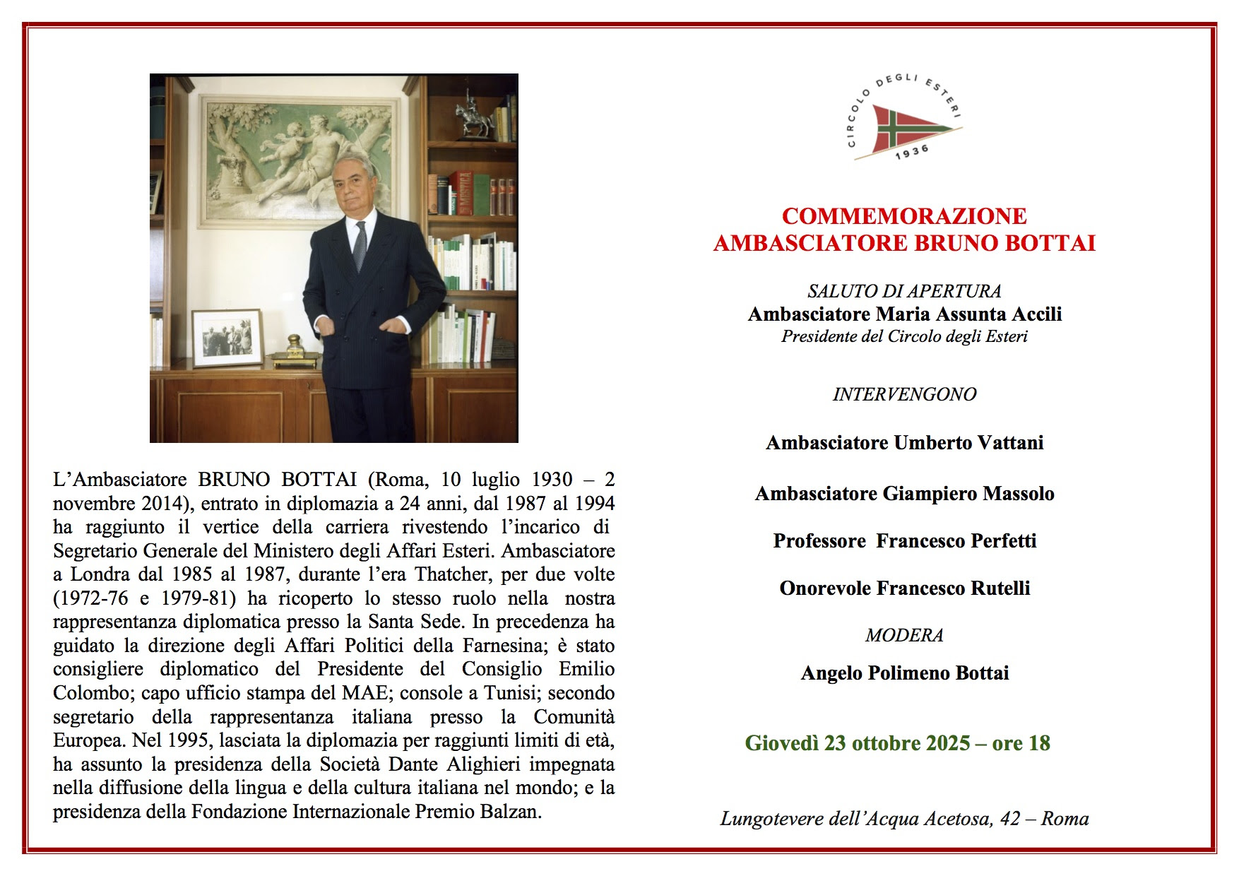 GD – Roma, 17 ott. 25 – Il Circolo degli Esteri commemorerà l’amb. Bruno Bottai, morto il 2 novembre 2014. L’evento di ricordo sarà introdotto dal saluto di apertura dell’amb. Maria Assunta Accili, presidente del Circolo degli Esteri. Intervengono l’amb. Umberto Vattani, già segretario generale della Farnesina; l’amb. Giampiero Massolo, il prof. Francesco Perfetti, l’on. Francesco Rutelli. Modera la rievocazione Angelo Polimeno Bottai, giornalista RAI. L’evento si terrà giovedì 23 ottobre, alle ore 18, nella sede del Lungotevere dell’Acqua Acetosa, 42 a Roma.