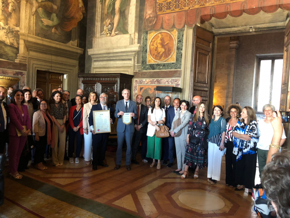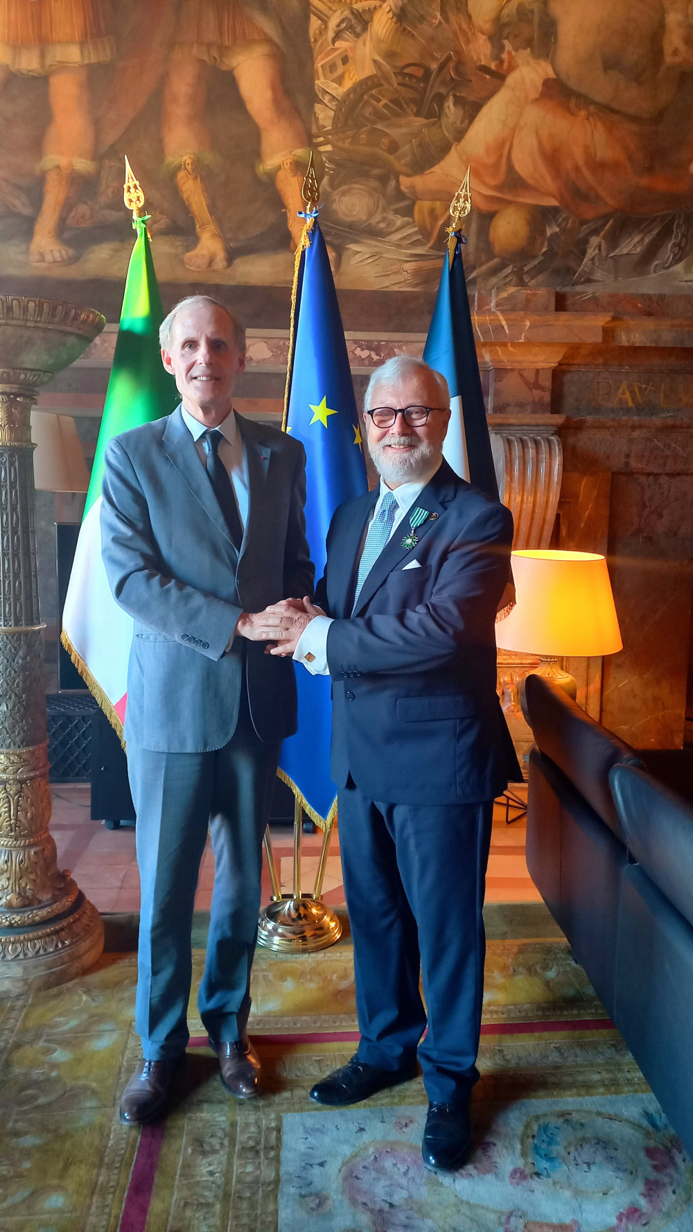 GD - Roma, 21 giu. 23 - Christian Masset, ambasciatore di Francia in Italia, ha insignito il direttore Gennaro Stroppolatini del titolo di Chevalier des Arts et des Lettres, ossia Cavaliere nell'Ordine delle Arti e delle Lettere, a nome del ministro della Cultura della Repubblica francese nel corso di una cerimonia che si è svolta a Palazzo Farnese, sede dell'Ambasciata di Francia in Italia.