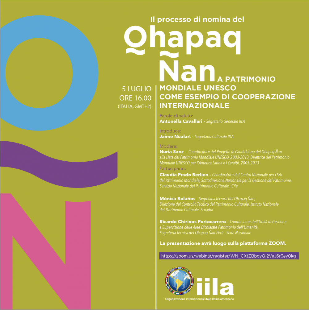 GD - Roma, 2 lug. 21 - Nell'ambito del ciclo di conferenze virtuali organizzate in occasione della mostra “Qhapaq Ñan, Il grande cammino delle Ande”, al MUCIV – Museo delle Civiltà, Roma, dall’11 maggio al 22 agosto 2021, l'IILA Organizzazione internazionale Italo-Latino Americana presenta la seconda conferenza, intitolata “Il processo di nomina del Qhapaq Ñan a Patrimonio Mondiale UNESCO come esempio di cooperazione internazionale”, che avrà luogo lunedì 5 luglio,ore 16.00 (Italia, GMT + 2).