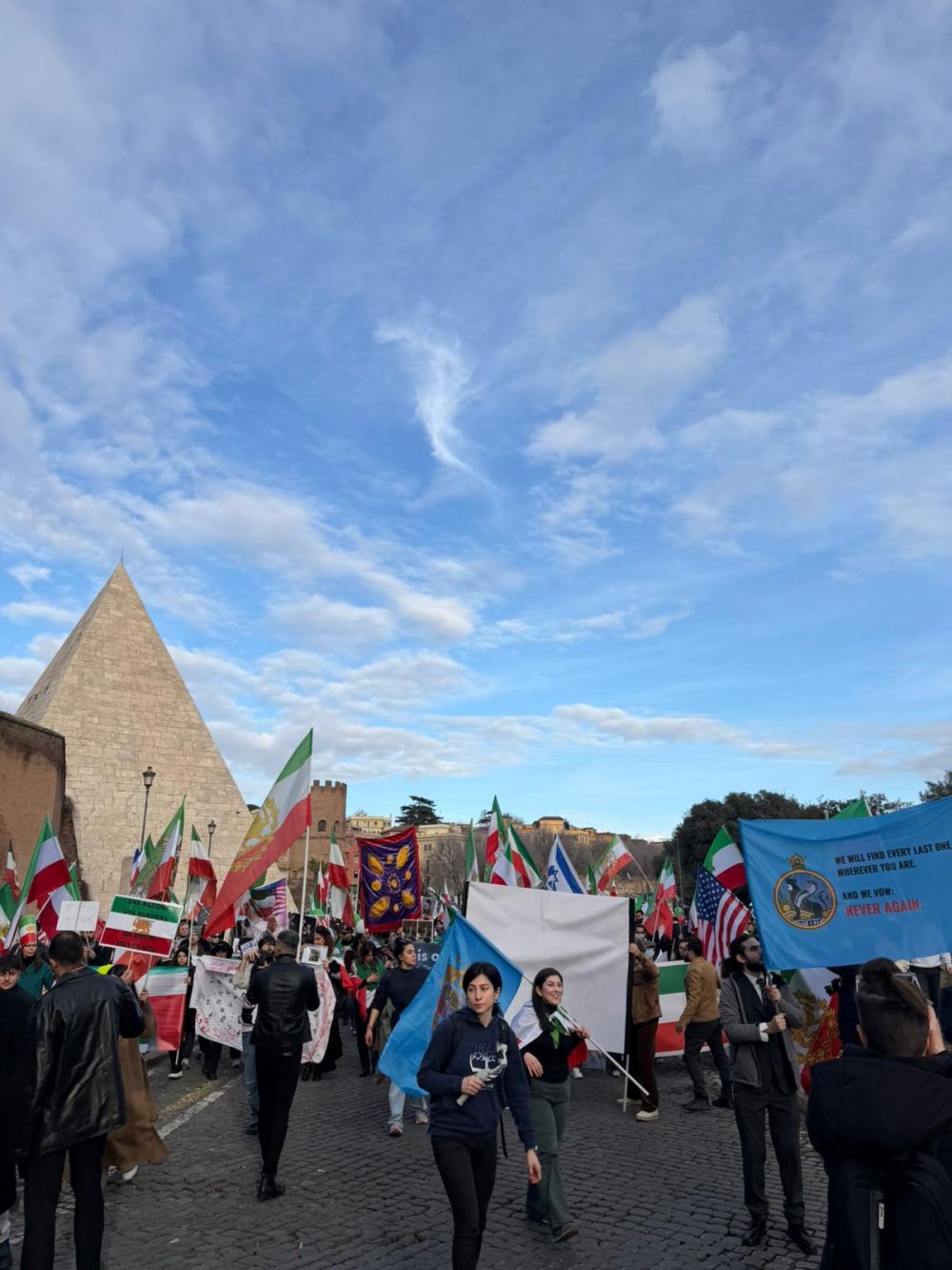 In piazza erano presenti le bandiere dei popoli che lottano contro regimi oppressivi e minacce terroristiche: dalla bandiera imperiale iraniana a quelle dello Stato di Israele, degli Stati Uniti e del Venezuela. Numerosi gli slogan scanditi dai manifestanti, tra cui “Javid Shah”, con cui il popolo iraniano, in patria e all’estero, chiede il ritorno del Principe Reza Pahlavi per guidare il Paese verso un futuro di libertà e democrazia.