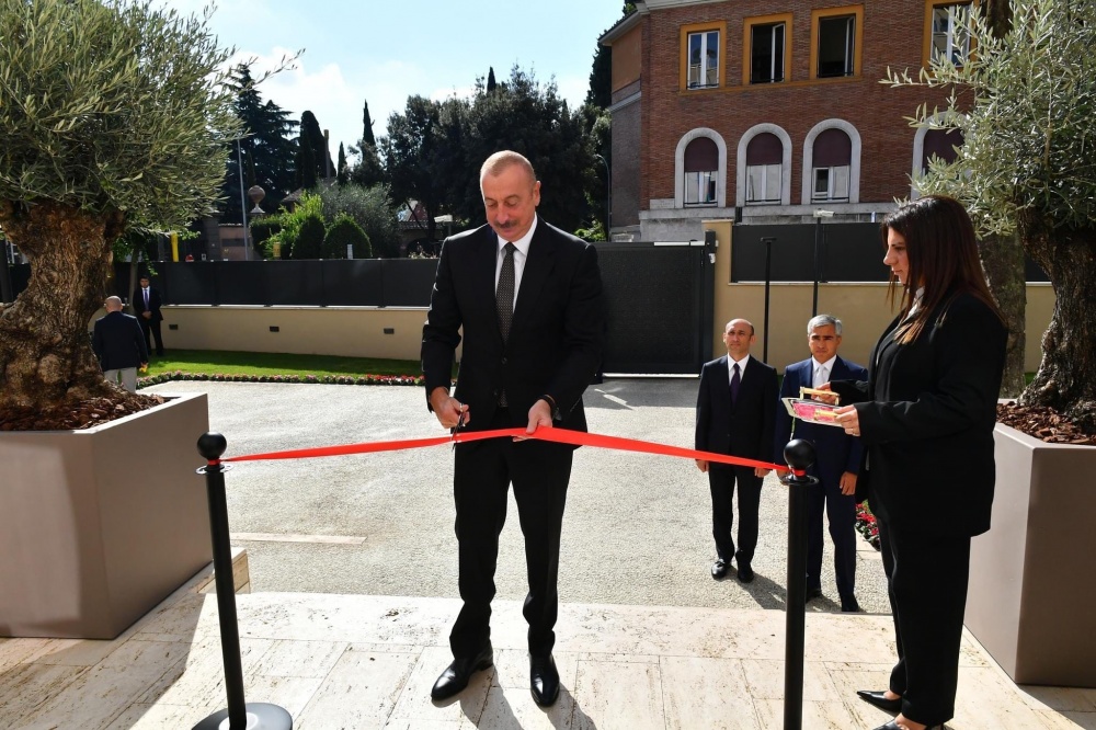 GD - Roma, 2 set. 22 - Il presidente della Repubblica dell'Azerbaigian, Ilham Aliyev, ha svolto una visita di lavoro in Italia il 1 e 2 settembre. Il programma è iniziato con l'inaugurazione della nuova sede dell'Ambasciata dell'Azerbaigian in Italia, in via Giovanni Battista de Rossi 27, nel cuore di Roma. Una sede di grande prestigio per l'Azerbaigian, che conferma il suo ruolo crescente di partner solido e affidabile per l'Italia. Nei sei piani dell'edificio, non solo gli uffici consolari e dell'Ambasciata, ma anche il Centro culturale dell'Azerbaigian, con esposizioni permanenti di oggetti artistici della cultura azerbaigiana e mostre temporanee.