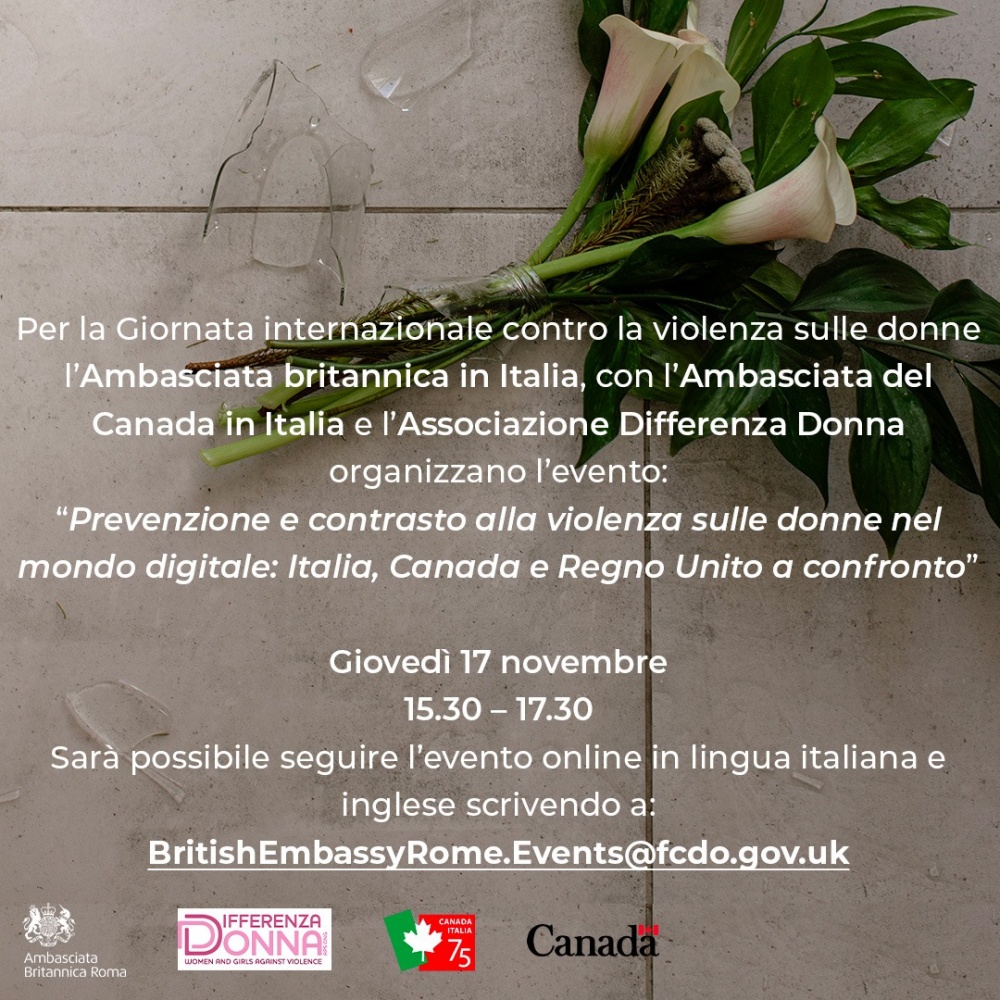 GD - Roma, 17 nov. 22 - In vista della Giornata Internazionale contro la Violenza sulle Donne, fissata dall’ONU per il 25 novembre, l’ambasciata britannica a Roma, l’ambasciata del Canada in Italia, e l’Associazione Differenza Donna si riuniscono di nuovo per organizzare un confronto internazionale sulla prevenzione ed il contrasto alla violenza sulle donne, con particolare riferimento al mondo digitale. L'appuntamento è per giovedì 17 novembre dalle ore 15:30 alle 17:30.