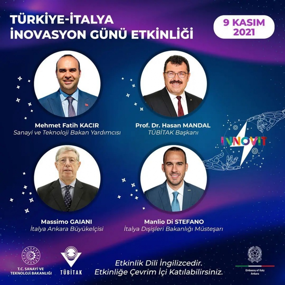 GD – Ankara, 11 nov. 21 - Si è tenuto nella sala congressi “Feza Gürsey” del Tübitak, il Consiglio per la Ricerca Scientifica e Tecnologica turco, la seconda edizione dell’”Italy-Turkey Innovation Day”, organizzata dall’Ambasciata d’Italia ad Ankara e dal Tübitak, con il coordinamento del Ministero turco dell’Industria e della Tecnologia e la partecipazione del Vice Ministro dell’Industria e della Tecnologia turco Mehmet Fatih Kacır, del Sottosegretario per gli Affari Esteri Manlio Di Stefano, dell’ambasciatore d’Italia in Turchia, Massimo Gaiani, e del presidente del Tübitak, prof. Hasan Mandal.