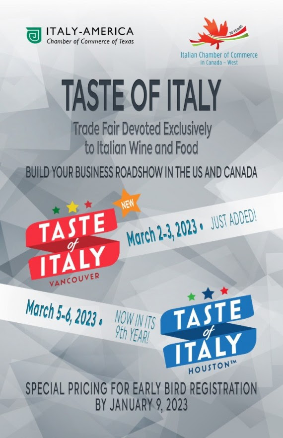 GD - Houston, 19 dic. 22 - La Italy-America Chamber of Commerce of Texas e la Italian Chamber of Commerce in Canada West hanno annunciato che "Taste of Italy", la più grande fiera negli Stati Uniti dedicata esclusivamente al Food & Wine italiani, avrà luogo per la prima volta a Vancouver, in Canada, il 2 e il 3 marzo 2023.