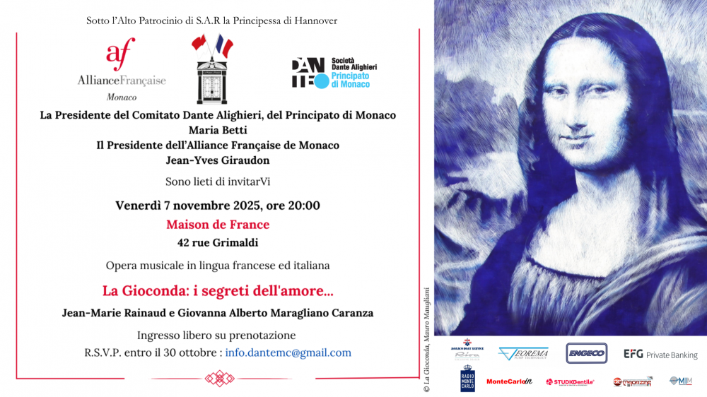 GD - Monte Carlo, 26 ott. 25 - Il Comitato Dante Alighieri del Principato di Monaco, sotto l’alto patrocinio della Principessa di Hannover, in collaborazione con l’Alliance Française de Monaco presenta, venerdì 7 novembre 2025 alle ore 20 alla Maison de France (in 42 rue Grimaldi), mette in scena la pièce musicale “la Gioconda: i segreti dell’amore...” / “La Joconde amoureuse”.