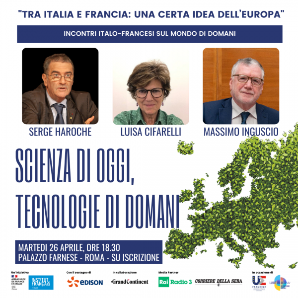GD - Roma, 8 apr. 22 - Nell’ambito dei Dialoghi del Farnese, a Palazzo Farnese, sede dell'ambasciata di Francia in Italia, martedì 26 aprile, alle ore 18.30, con l’introduzione di Christian Masset, ambasciatore di Francia in Italia, si svolgerà il confronto "Scienza di oggi, tecnologie di domani" con il Premio Nobel Serge Haroche, Luisa Cifarelli professoressa di Fisica Sperimentale all’Università di Bologna, e Massimo Inguscio, professore emerito di Fisica della materia all’Università Campus Bio-Medico (UCBM) di Roma e socio dell’Accademia Nazionale dei Lincei.