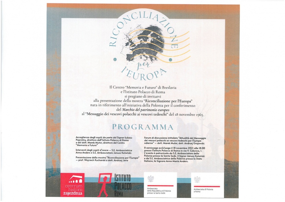 GD - Roma, 12 nov. 21 - L'ambasciata di Polonia presso la Santa Sede ha promosso la mostra "Riconciliazione per l’Europa", la cui inaugurazione si terrà giovedì 18 novembre alle ore 18:00 all'Istituto Polacco di Roma, in Via Vittoria Colonna 1.