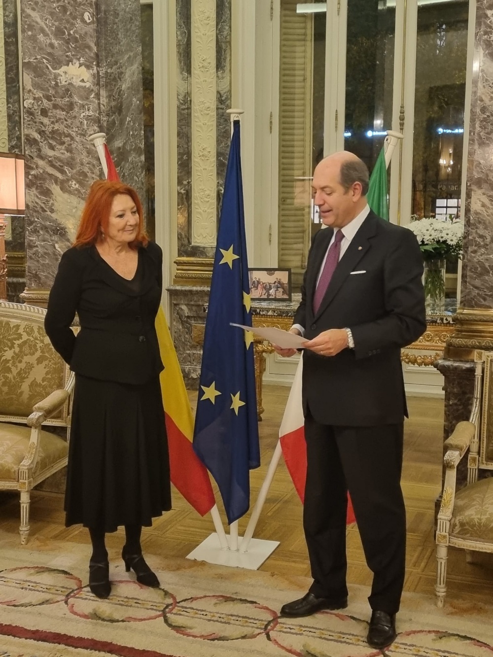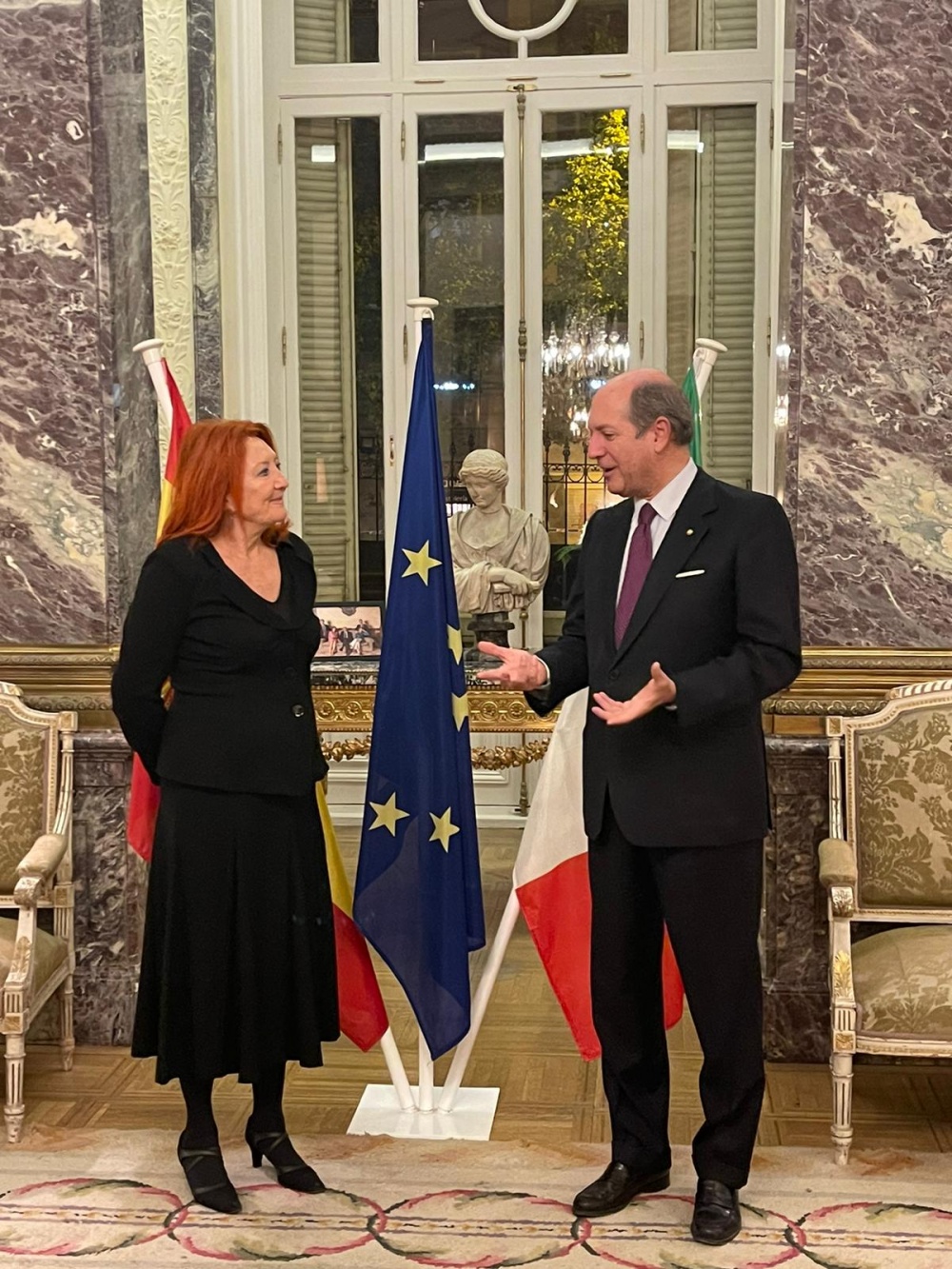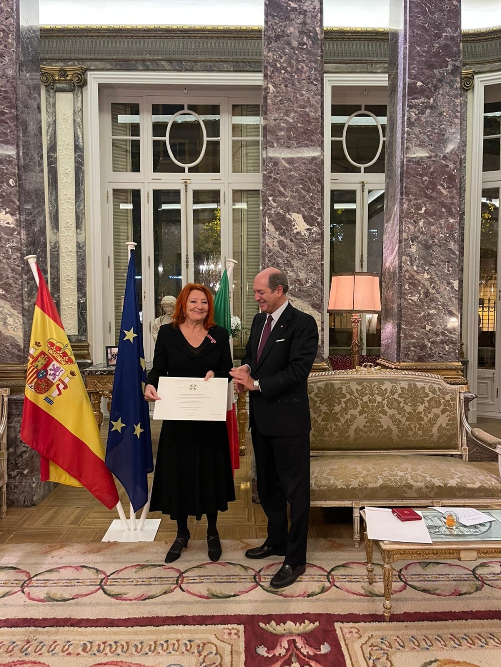 GD – Madrid, 26 ott. 22 - Nell'ambasciata d’Italia a Madrid, l'amb. Riccardo Guariglia ha consegnato a Maria Sheila Cremaschi, brillante organizzatrice di eventi culturali, le insegne di Cavaliere dell'Ordine della Stella d’Italia.