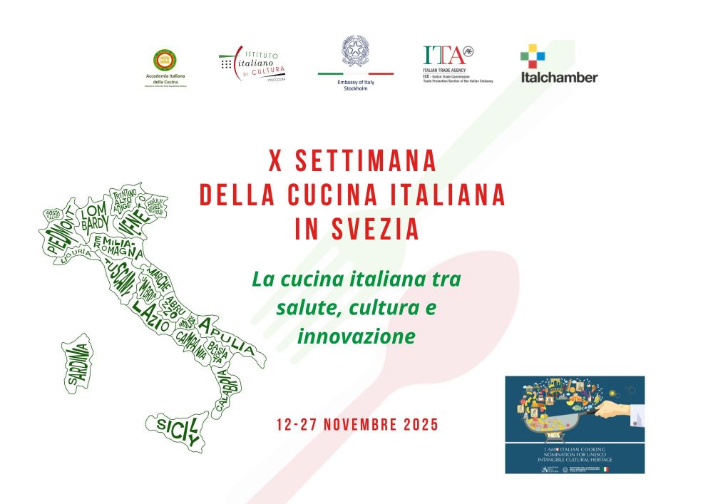 L’ultima iniziativa di questa decima edizione sarà l’arrivo nella capitale del Gourmetbus Italia, che fa tappa in Svezia in occasione della Settimana della Cucina. Un viaggio unico attraverso sapori, racconti e atmosfere che celebrano l’eccellenza gastronomica italiana. L’evento è organizzato da ENIT in collaborazione con l’Ambasciata d’Italia a Stoccolma.