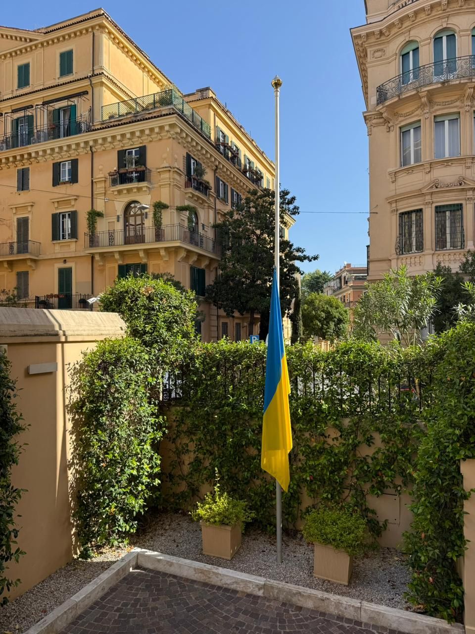 GD - Roma, 17 apr. 26 - Oggi, nell'Ambasciata d'Ucraina in Italia, la bandiera è a mezz'asta in segno di lutto per le vittime dell'attacco combinato russo contro l'Ucraina.