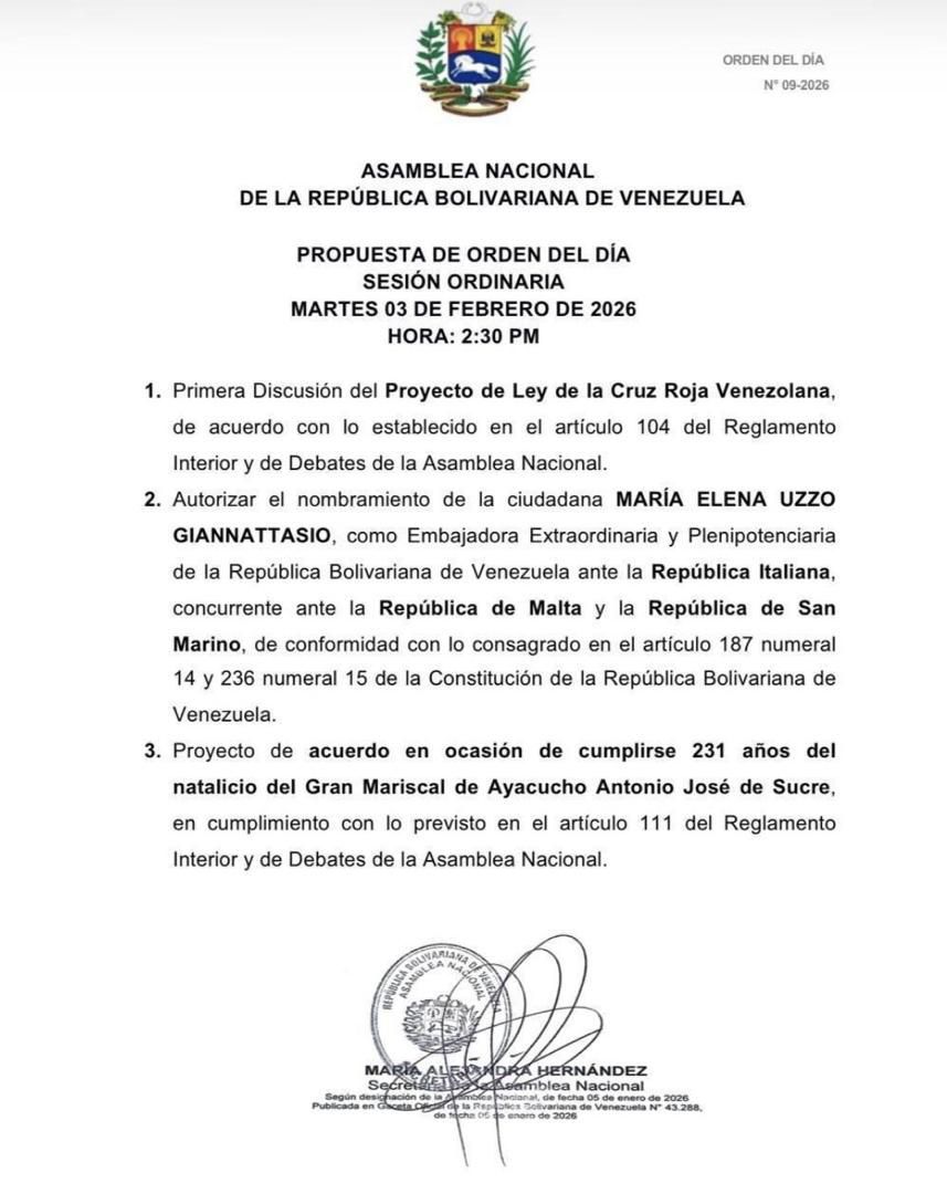 GD - Caracas, 3 feb. 26 - L'Assemblea Nazionale della Repubblica Bolivariana di Venezuela ha proposto, nella riunione odierna, di nominare Maria Elena Uzzo Giannattasio nuovo ambasciatore straordinario e plenipotenziario in Italia, Malta e San Marino.